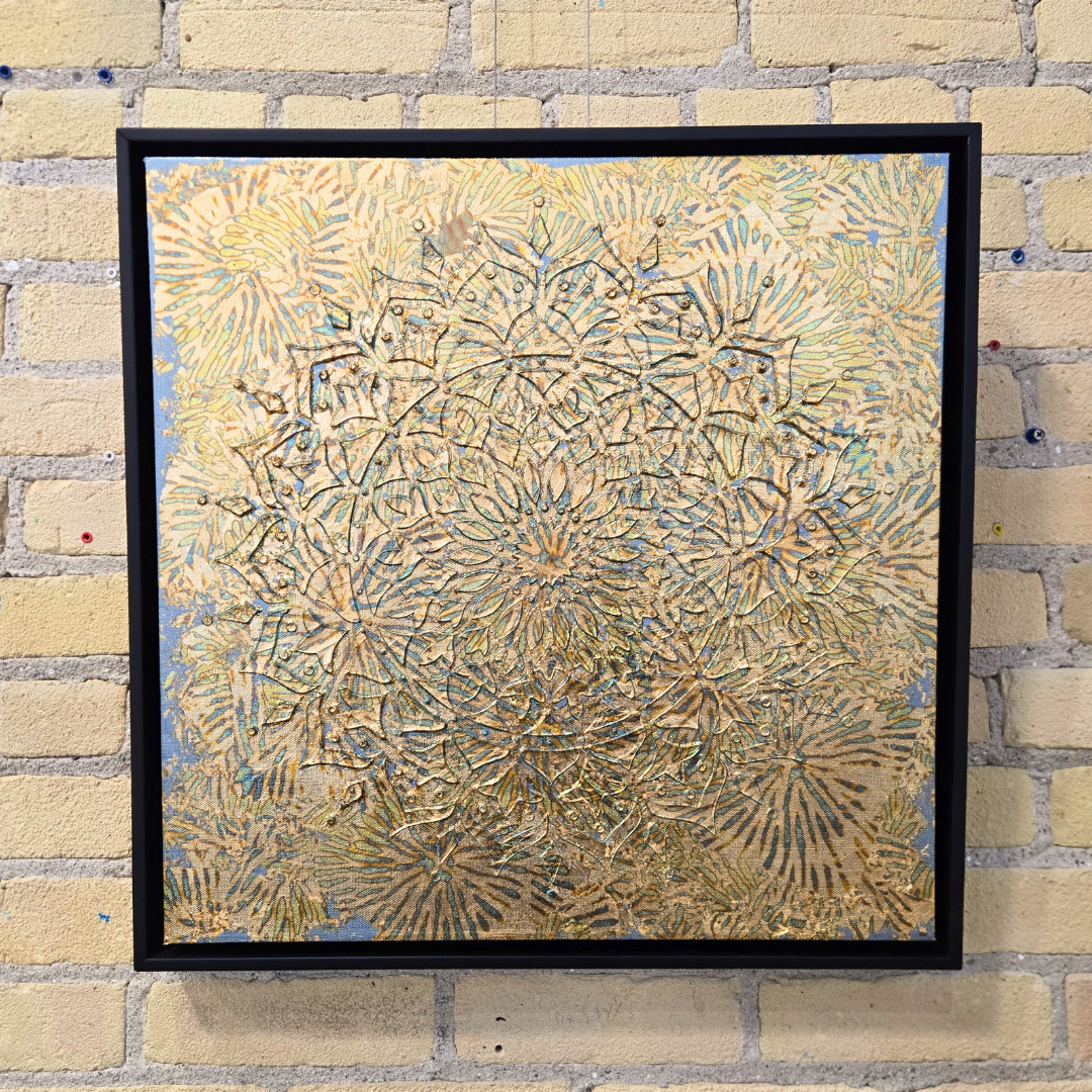 Acrylic pen and paint, stencil, and gold and blue foil
