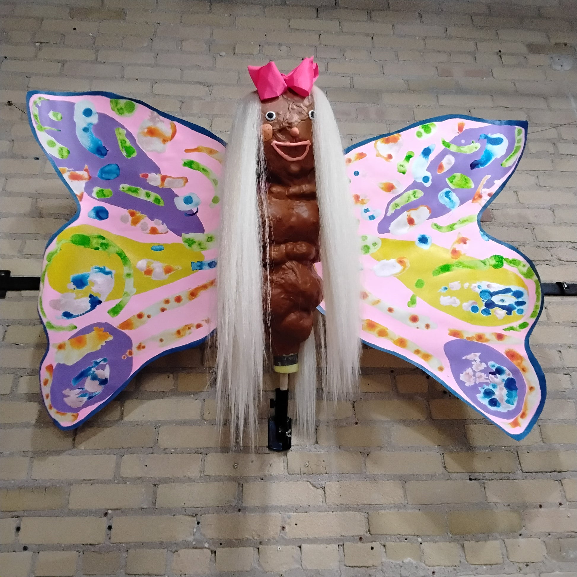 paper, epoxy clay, pool noodles, bow, fake hair, ink, and acrylic